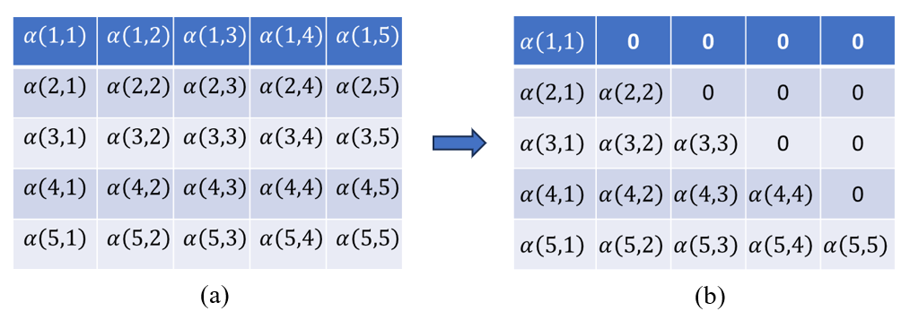 Let’s see mathematically how to achieve this through an attention score matrix. Fig.6(a) below shows the attention score matrix for just 5 tokens for the sake of demonstration. It will have a shape of \(T \times T\) for \(T\) sequences. Here, the attention score : \(\alpha (i, j)\) represents how much \(i\) pays attention to \(j\).