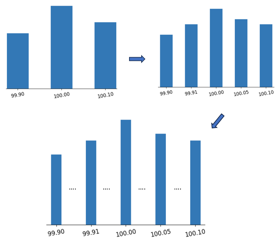 And if we want to make them still more granular, we can make the ranges even smaller, like 0.005 mm. And now we have all this information between 99.90 and 99.905 mm, between 99.905 and 99.91 mm, all the way to between 100.095 and 100.10 mm. And we can continue splitting these ranges and getting discrete distributions. And if we were to do this infinitely many times, then what we get is this: a continuous distribution. Imagine just a bunch of very, very skinny bars, infinitely many of them, that become just a curve.